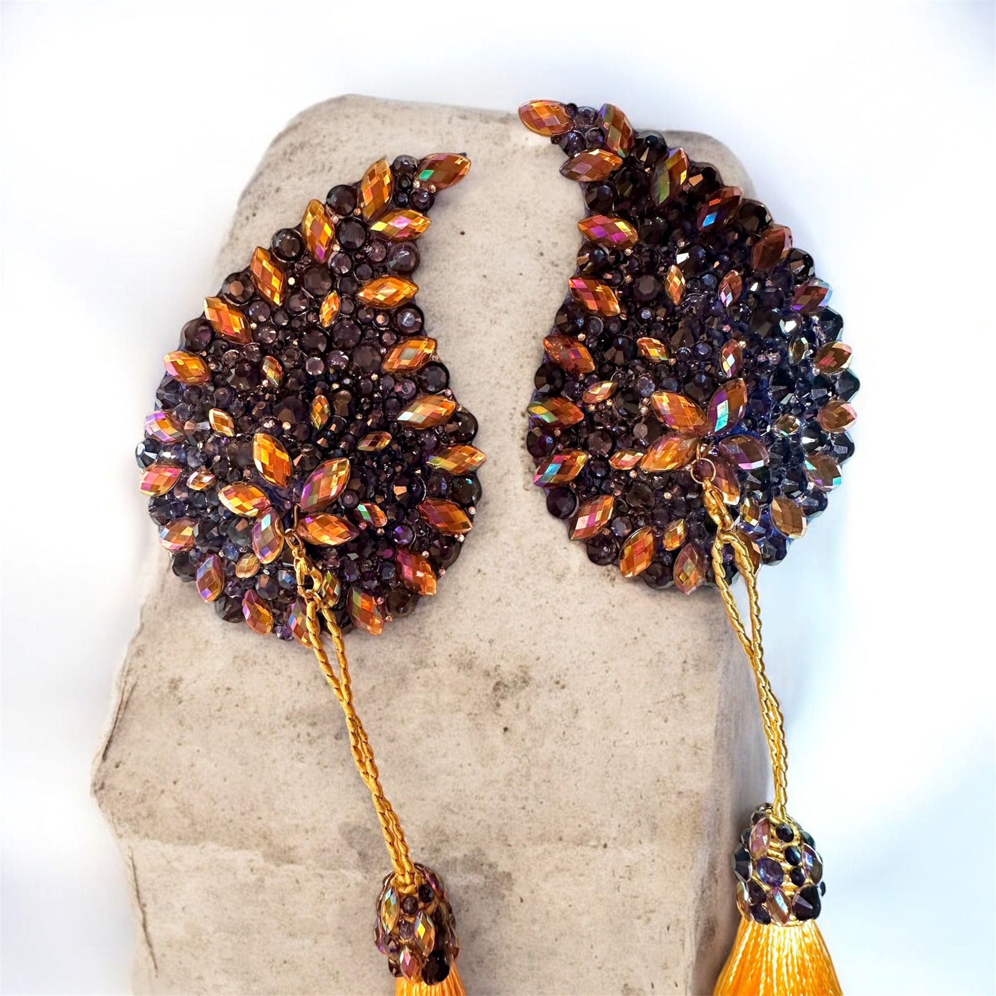 PASTIES DUNKELBLAU-GOLD MIT ABNEHMBAREN TASSEL WINGS – HANDGEFERTIGTE GLITZER NIPPEL COVER AUS ECHTLEDER FÜR BURLESQUE UND FESTIVALS